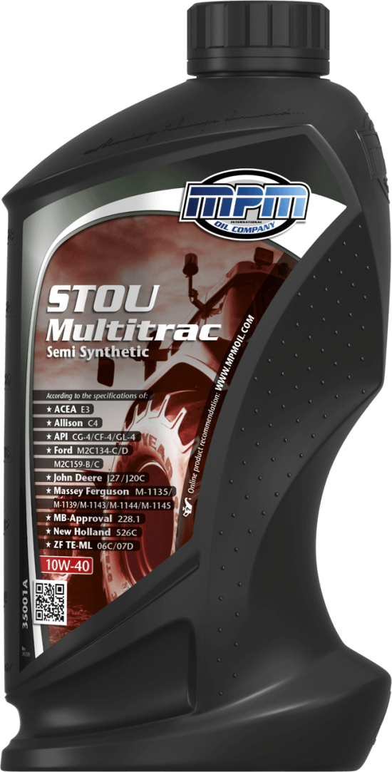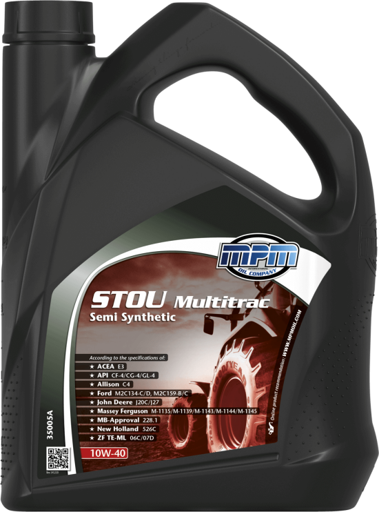 Deze semi synthetische STOU (Super Tractor Oil Universal) multitrac SAE 10W-40 multifunctionele landbouwolie is speciaal ontwikkeld voor in dieselmotoren, transmissies, power take-off, natte remmen, hydraulische systemen, stuurbekrachtiging en eindaandrijving van o.a. tractoren, combines weg- en waterbouwmachines.