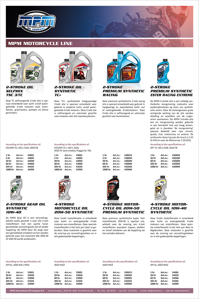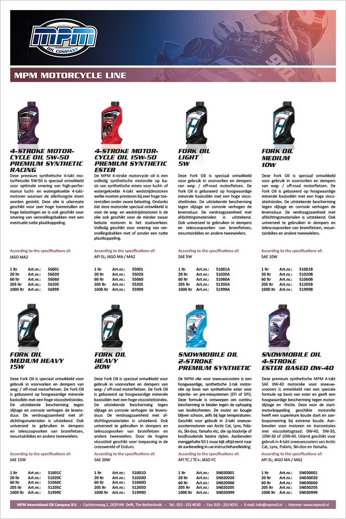 MPM International Oil Company levert een complete lijn minerale en synthetische smeermiddelen voor competitiemotoren, quads en karts, straatmotoren, moderne en klassieke bromfietsen en scooters.