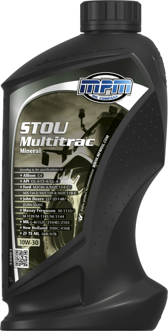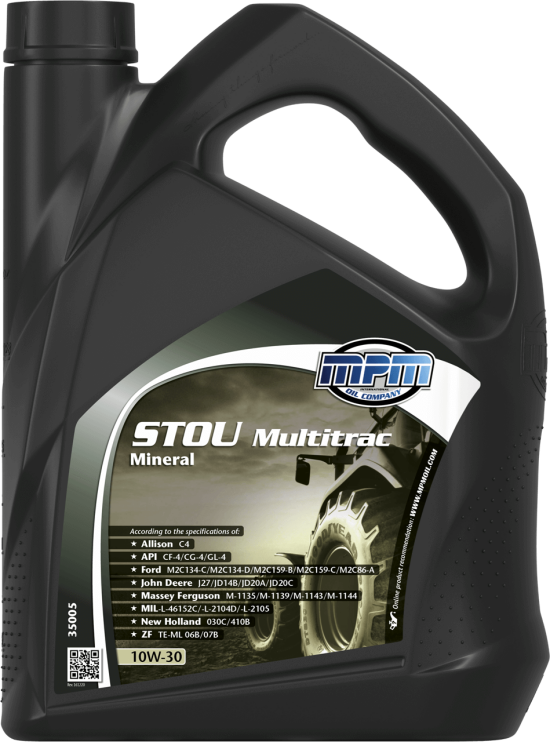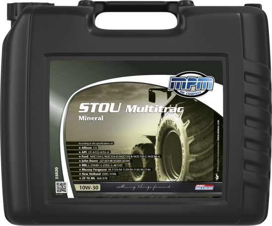 Deze minerale STOU (Super Tractor Oil Universal) multitrac SAE 10W-30 multifunctionele landbouwolie is speciaal ontwikkeld voor in dieselmotoren, transmissies, power take-off, natte remmen, hydraulische systemen, stuurbekrachtiging en eindaandrijving van o.a. tractoren, combines weg- en waterbouwmachines.
