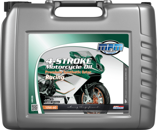 MPM 4-Stroke Motorcycle Oil 10W-60 Premium Synthetic Ester Technologie is speciaal ontwikkeld voor lucht- en watergekoelde 4-takt motoren die extreem worden belast bij wedstrijdomstandigheden. Vanwege de hoge viscositeit en het geavanceerde additievenpakket is deze olie speciaal ontwikkeld om de zwaarste uitdagingen tijdens wedstrijdgebruik aan te gaan. In combinatie met ester technologie biedt deze olie de optimale bescherming van de motor. Deze multigrade motorolie is ontwikkeld voor Wegrace- en Off Road motoren, maar is tevens geschikt voor standaard motorfietsen waar een SAE 10W-60 wordt aanbevolen. De prestatie is van het hoogste niveau en vermindert het olieverbruik en verlengt de levensduur van de motor. Deze motorolie is geschikt voor smering van motoren en transmissies met of zonder natte plaatkoppelingen.